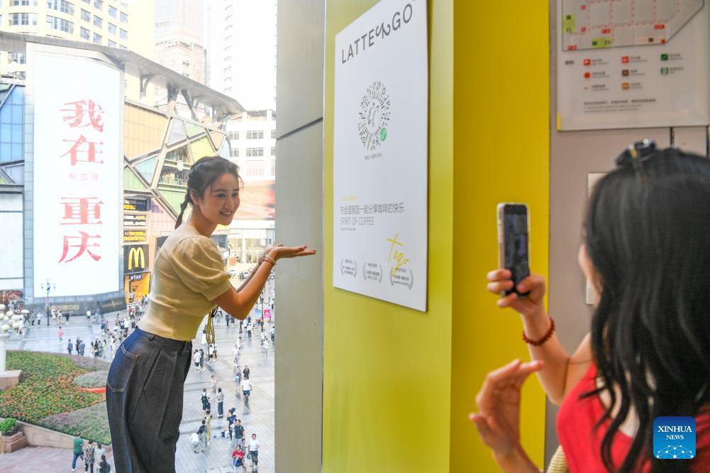 A tourist poses for photos at Jiefangbei, a core business area in southwest China's Chongqing Municipality, Aug. 21, 2024. (Xinhua/Wang Quanchao)