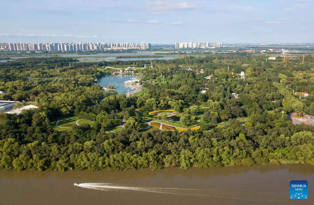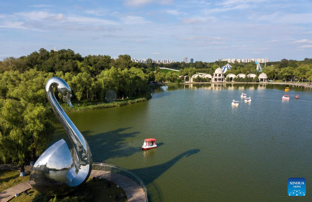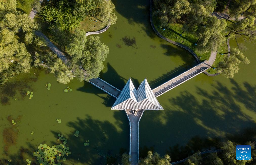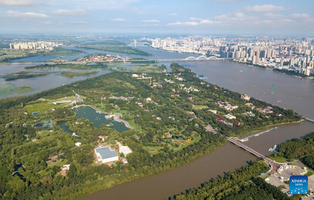 An aerial drone photo taken on Aug. 20, 2024 shows a view of Sun Island scenic spot in the Taiyangdao (Sun Island) National Wetland Park in Harbin, northeast China's Heilongjiang Province. The Taiyangdao National Wetland Park in Harbin, northeast China's Heilongjiang Province covers a total area of more than 10,000 hectares, of which more than 70% are wetlands. With its beautiful ecological environment, the park has become a good place for citizens and tourists to visit. (Xinhua/Wang Jianwei)