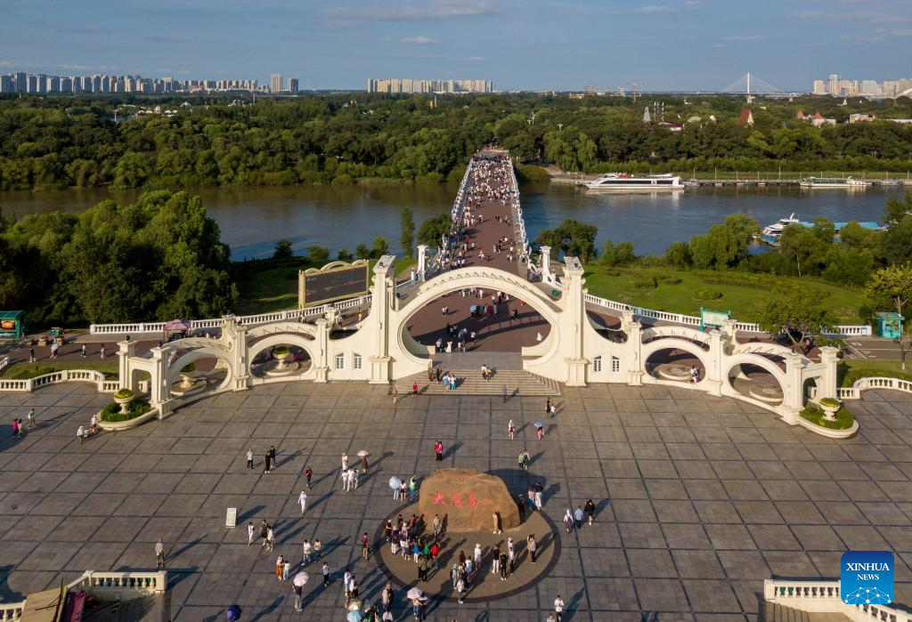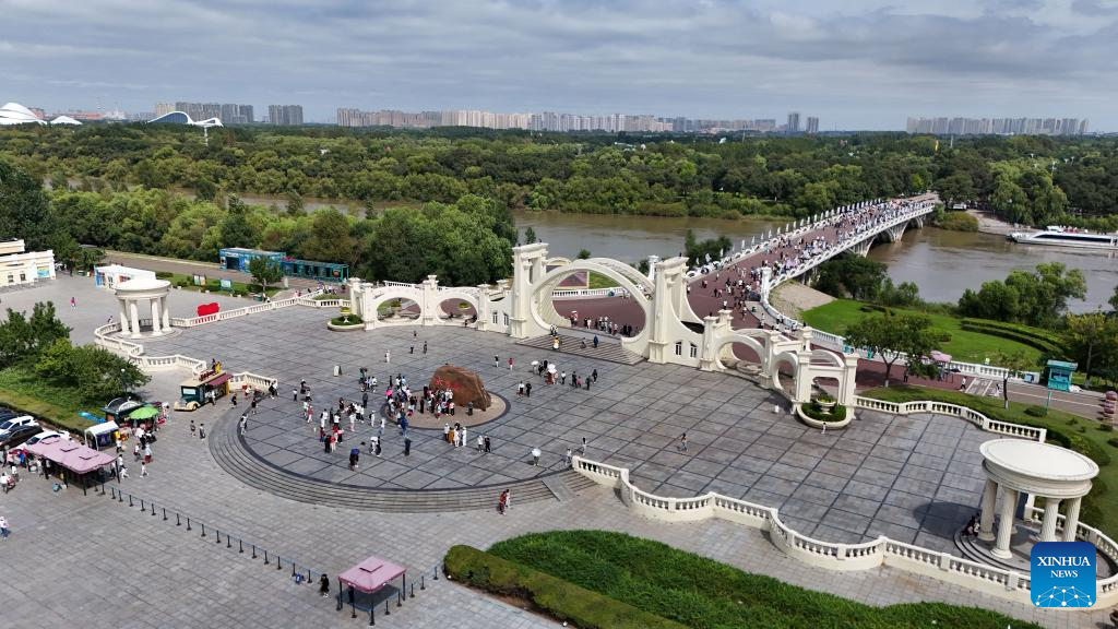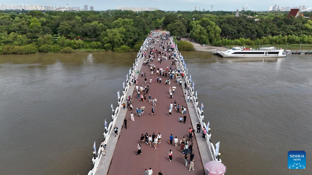An aerial drone photo taken on Aug. 20, 2024 shows people visiting Sun Island scenic spot in the Taiyangdao (Sun Island) National Wetland Park in Harbin, northeast China's Heilongjiang Province. The Taiyangdao National Wetland Park in Harbin, northeast China's Heilongjiang Province covers a total area of more than 10,000 hectares, of which more than 70% are wetlands. With its beautiful ecological environment, the park has become a good place for citizens and tourists to visit. (Xinhua/Wang Jianwei)