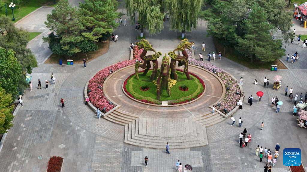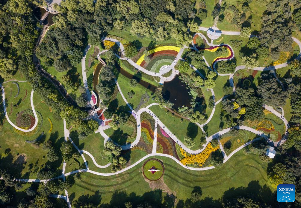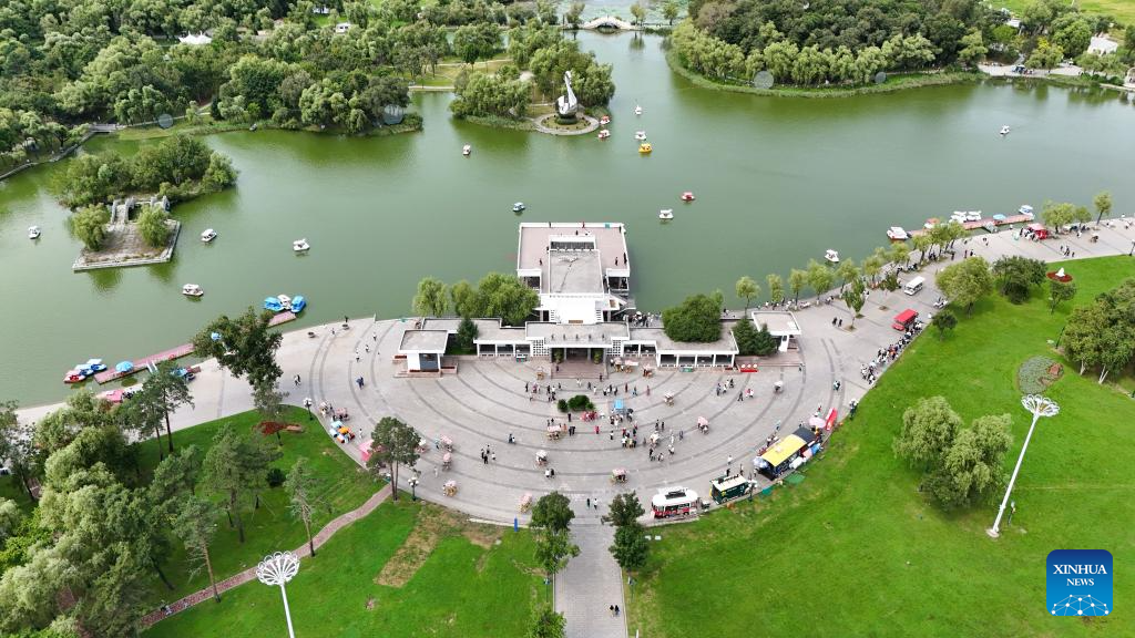 An aerial drone photo taken on Aug. 20, 2024 shows people visiting a botanic garden of Sun Island scenic spot in the Taiyangdao (Sun Island) National Wetland Park in Harbin, northeast China's Heilongjiang Province. The Taiyangdao National Wetland Park in Harbin, northeast China's Heilongjiang Province covers a total area of more than 10,000 hectares, of which more than 70% are wetlands. With its beautiful ecological environment, the park has become a good place for citizens and tourists to visit. (Xinhua/Wang Jianwei)