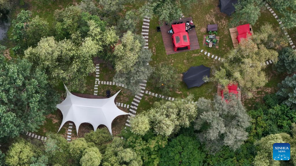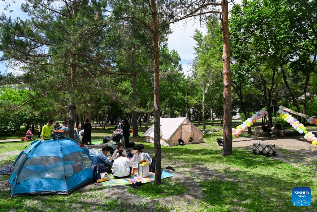 People camp at Sun Island scenic spot in the Taiyangdao (Sun Island) National Wetland Park in Harbin, northeast China's Heilongjiang Province, June 4, 2024. The Taiyangdao National Wetland Park in Harbin, northeast China's Heilongjiang Province covers a total area of more than 10,000 hectares, of which more than 70% are wetlands. With its beautiful ecological environment, the park has become a good place for citizens and tourists to visit. (Xinhua/Wang Song)
