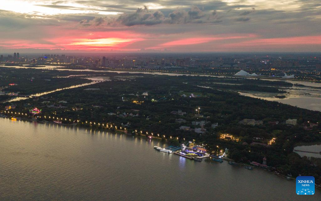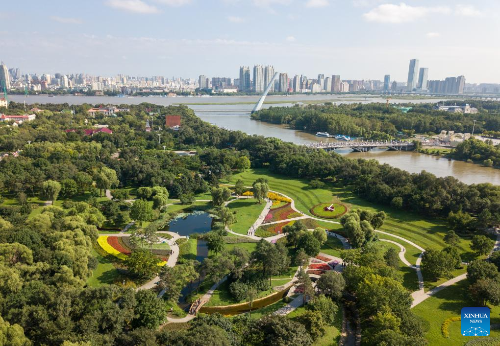 An aerial drone photo taken on Aug. 20, 2024 shows a view of Sun Island scenic spot in the Taiyangdao (Sun Island) National Wetland Park in Harbin, northeast China's Heilongjiang Province. The Taiyangdao National Wetland Park in Harbin, northeast China's Heilongjiang Province covers a total area of more than 10,000 hectares, of which more than 70% are wetlands. With its beautiful ecological environment, the park has become a good place for citizens and tourists to visit. (Xinhua/Wang Song)