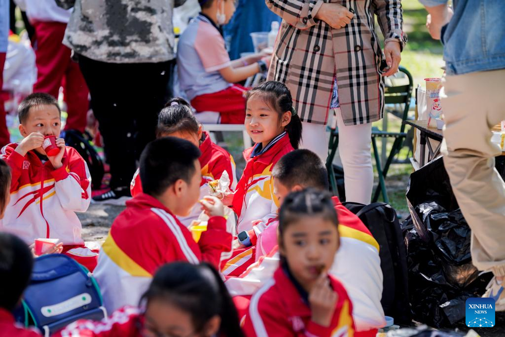Students attend an ecological event at Sun Island scenic spot in the Taiyangdao (Sun Island) National Wetland Park in Harbin, northeast China's Heilongjiang Province, June 4, 2024. The Taiyangdao National Wetland Park in Harbin, northeast China's Heilongjiang Province covers a total area of more than 10,000 hectares, of which more than 70% are wetlands. With its beautiful ecological environment, the park has become a good place for citizens and tourists to visit. (Xinhua/Wang Song)