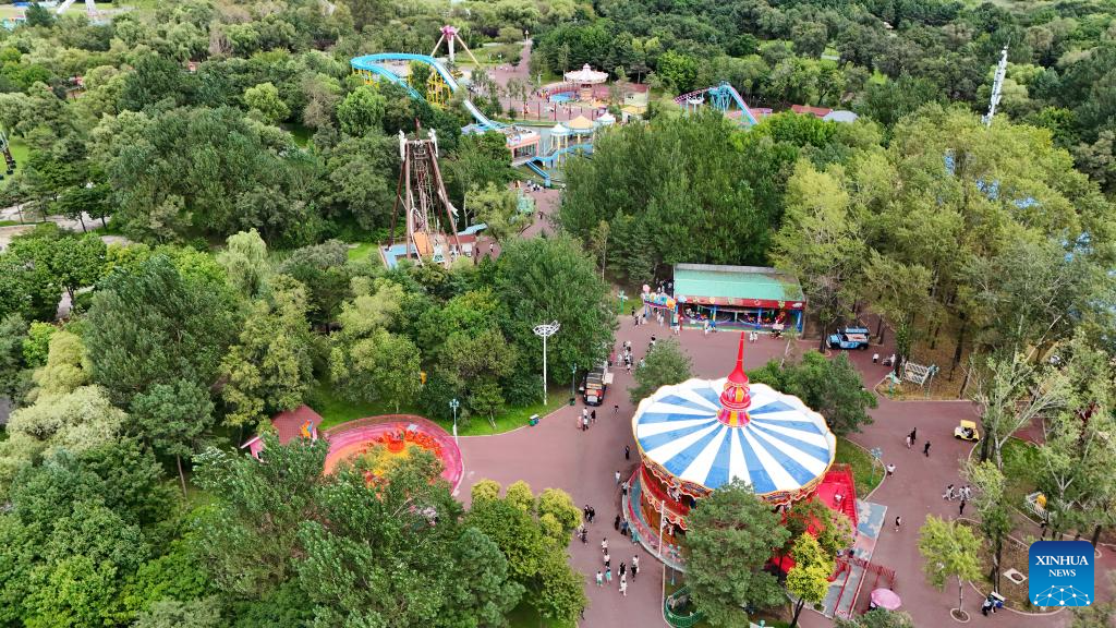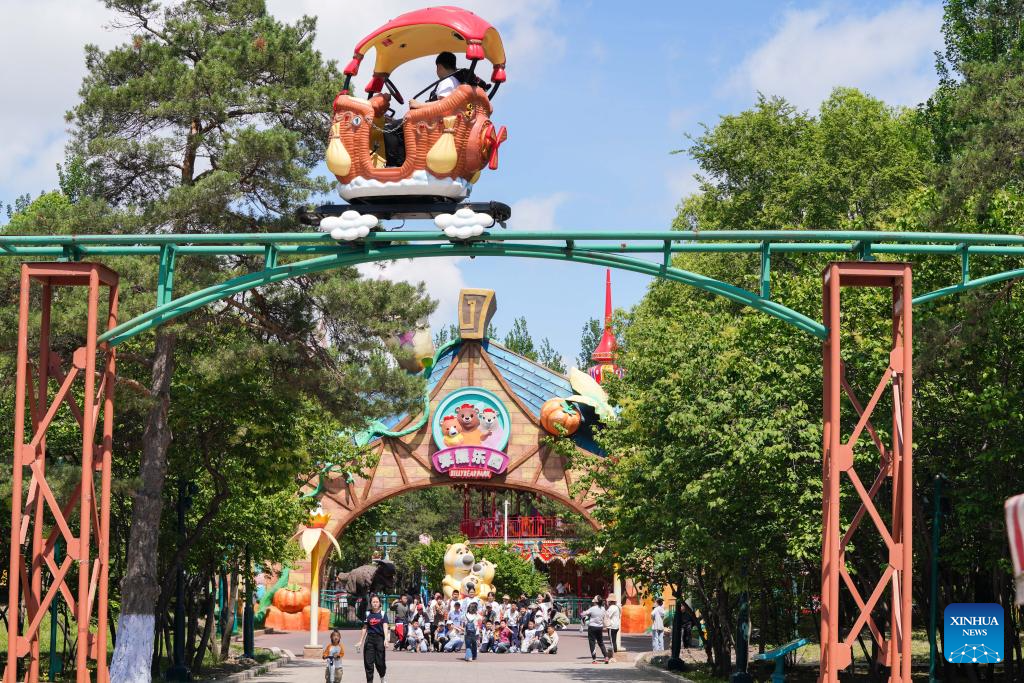 People visit an amusement park of Sun Island scenic spot in the Taiyangdao (Sun Island) National Wetland Park in Harbin, northeast China's Heilongjiang Province, June 4, 2024. The Taiyangdao National Wetland Park in Harbin, northeast China's Heilongjiang Province covers a total area of more than 10,000 hectares, of which more than 70% are wetlands. With its beautiful ecological environment, the park has become a good place for citizens and tourists to visit. (Xinhua/Wang Song)