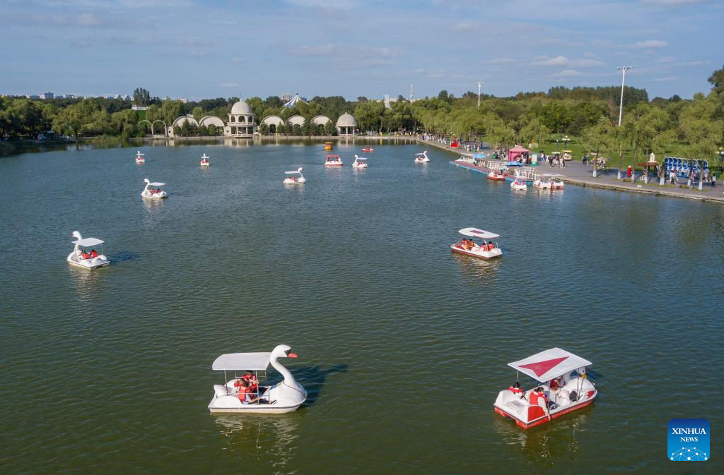 An aerial drone photo taken on Aug. 20, 2024 shows people taking boats at Sun Island scenic spot in the Taiyangdao (Sun Island) National Wetland Park in Harbin, northeast China's Heilongjiang Province. The Taiyangdao National Wetland Park in Harbin, northeast China's Heilongjiang Province covers a total area of more than 10,000 hectares, of which more than 70% are wetlands. With its beautiful ecological environment, the park has become a good place for citizens and tourists to visit. (Xinhua/Wang Jianwei)
