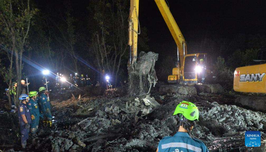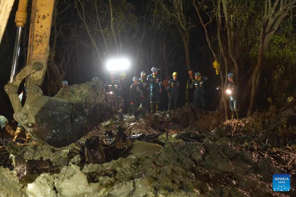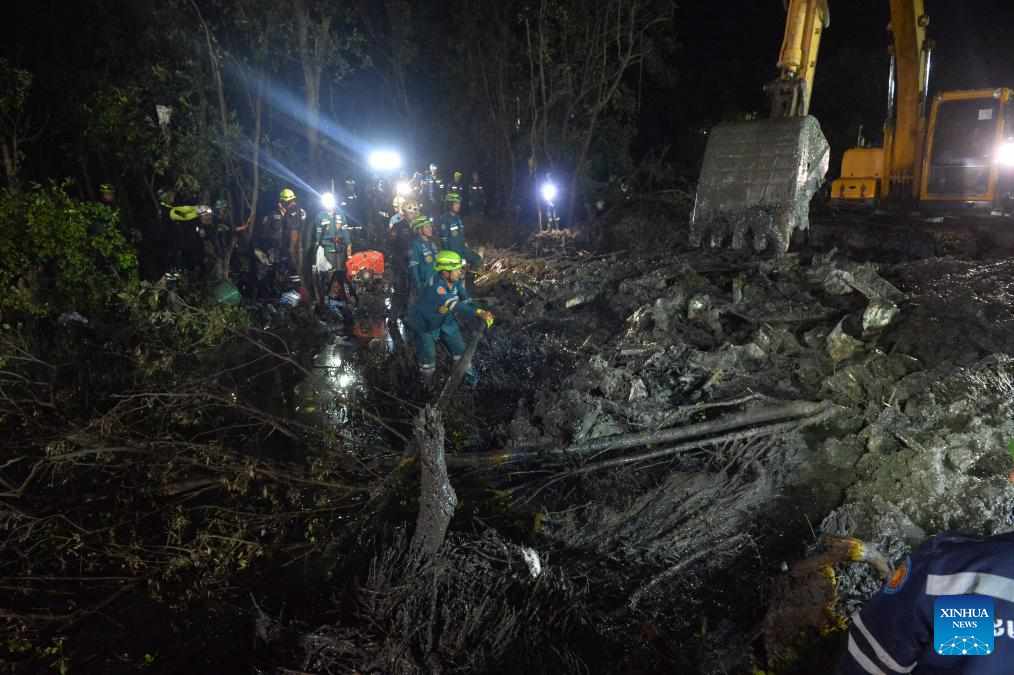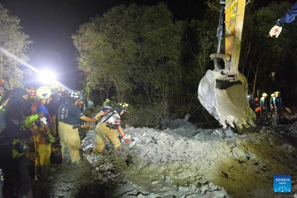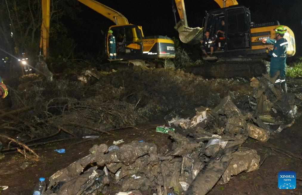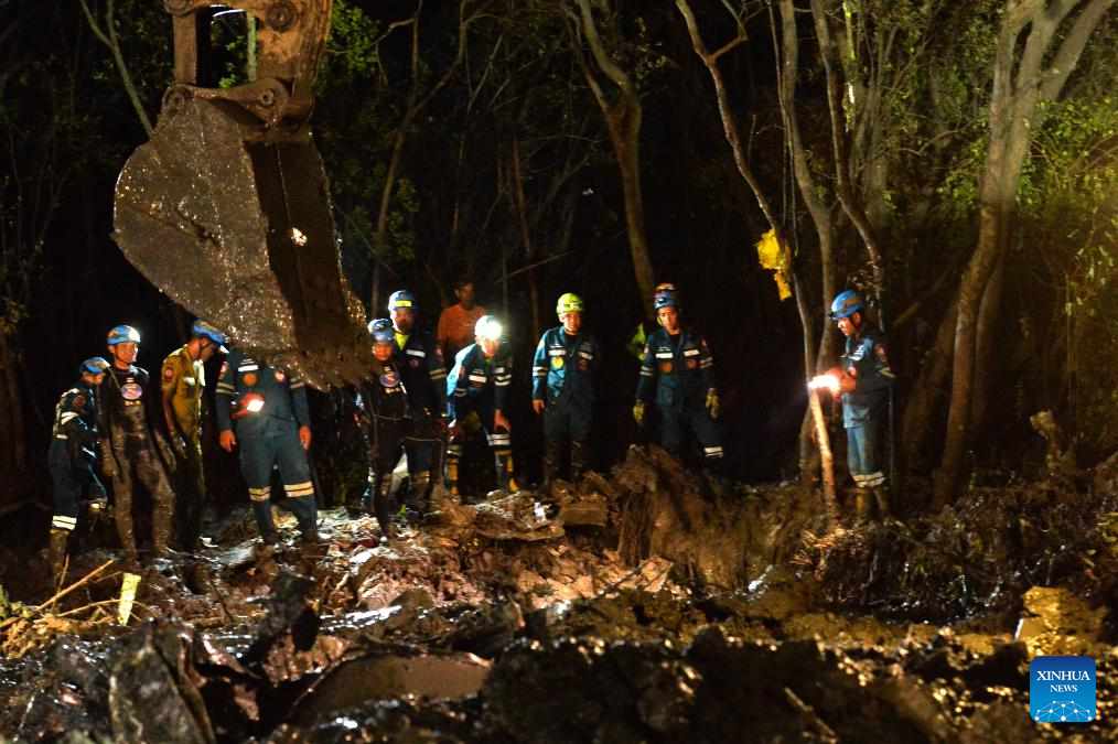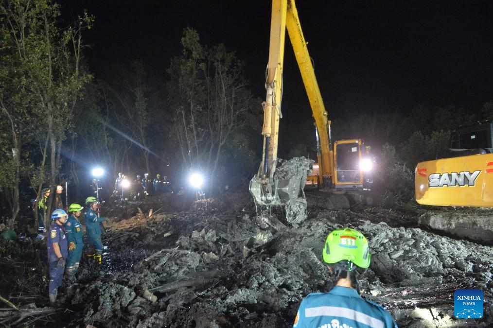 Rescuers work at the site of a small plane crash in Chachoengsao province, Thailand, early on August 23, 2024. Five Chinese nationals were confirmed dead in the small plane crash in Thailand's eastern province of Chachoengsao on Thursday, the Chinese embassy in Thailand told Xinhua, citing Thai authorities. (Photo by Rachen Sageamsak/Xinhua)