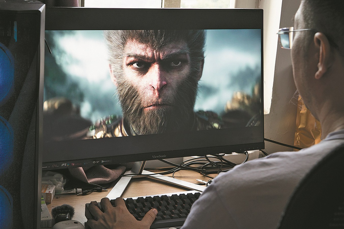 A gamer watches a promotional video for Black Myth: Wukong, a game developed by Chinese company Game Science, in Beijing on Aug 20, 2024, after the game was released worldwide. PAI GU/CHINA NEWS SERVICE