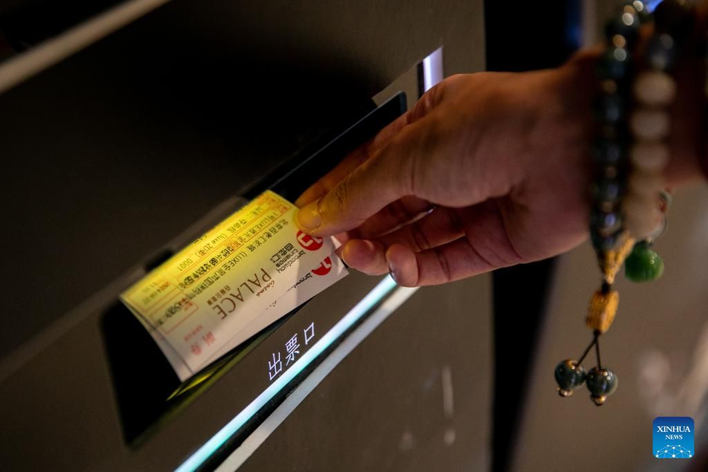 A movie goer claims tickets from a self-service machine at a cinema in Beijing, capital of China, Aug. 22, 2024. By early Sunday morning, the summer box office period -- June 1 to Aug. 31 -- had amassed 10 billion yuan (1.40 billion U.S. dollars), with cinema admissions totaling 243 million, according to data from ticketing platform Maoyan. (Xinhua/Chu Jiayin)