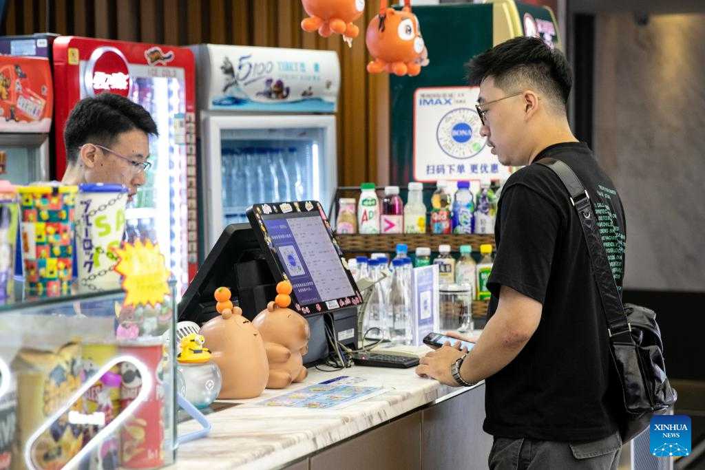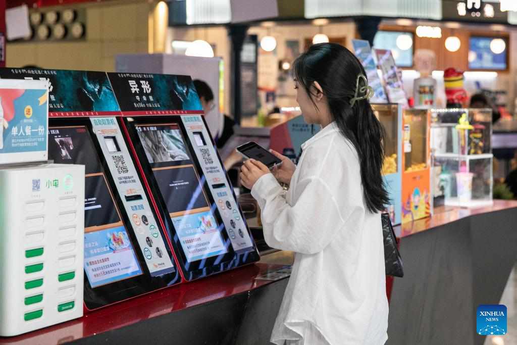 A movie goer buys tickets at a cinema in Beijing, capital of China, Aug. 21, 2024. By early Sunday morning, the summer box office period -- June 1 to Aug. 31 -- had amassed 10 billion yuan (1.40 billion U.S. dollars), with cinema admissions totaling 243 million, according to data from ticketing platform Maoyan. (Xinhua/Chu Jiayin)