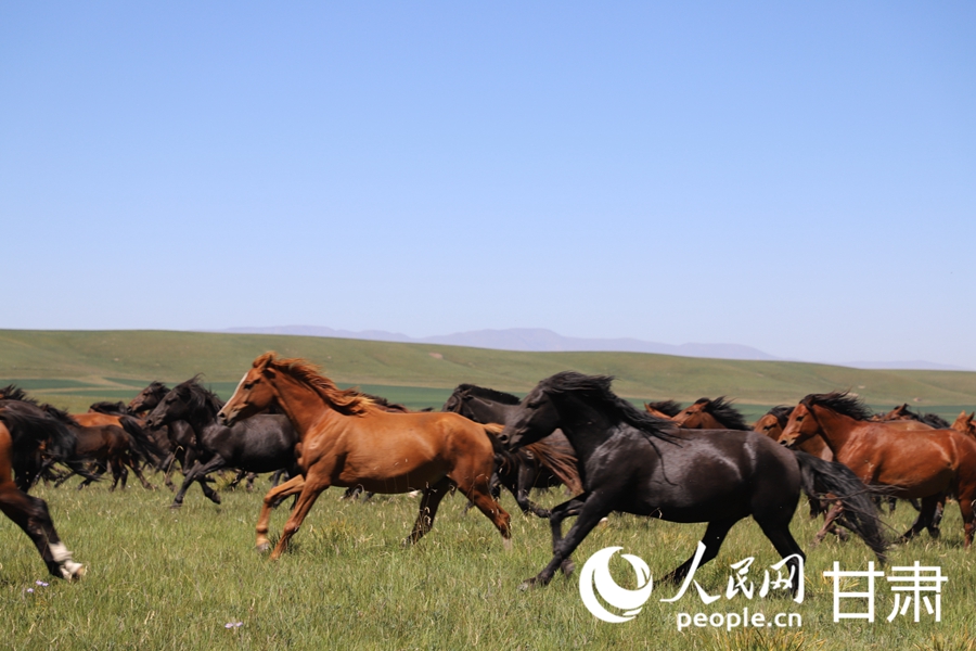 Photo shows charming scenery of Qilian Mountains with vibrant grass and vigorous horses in northwest China's Gansu province. (People's Daily Online / Huang Fan)