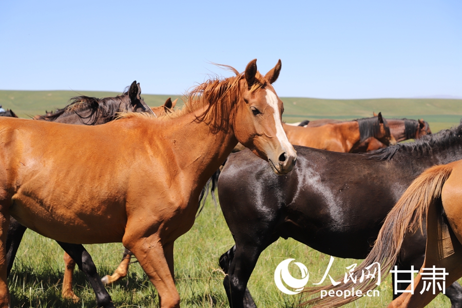 Photo shows charming scenery of Qilian Mountains with vibrant grass and vigorous horses in northwest China's Gansu province. (People's Daily Online / Huang Fan)