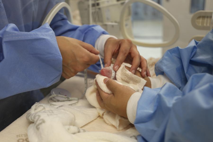 Staff members measure one of the giant panda twins at Zoo Berlin in Berlin, capital of Germany, Aug. 22, 2024. Meng Meng, an 11-year-old female giant panda at Zoo Berlin, has given birth to twins, zoo authorities announced on Friday. (Zoo Berlin/Handout via Xinhua)