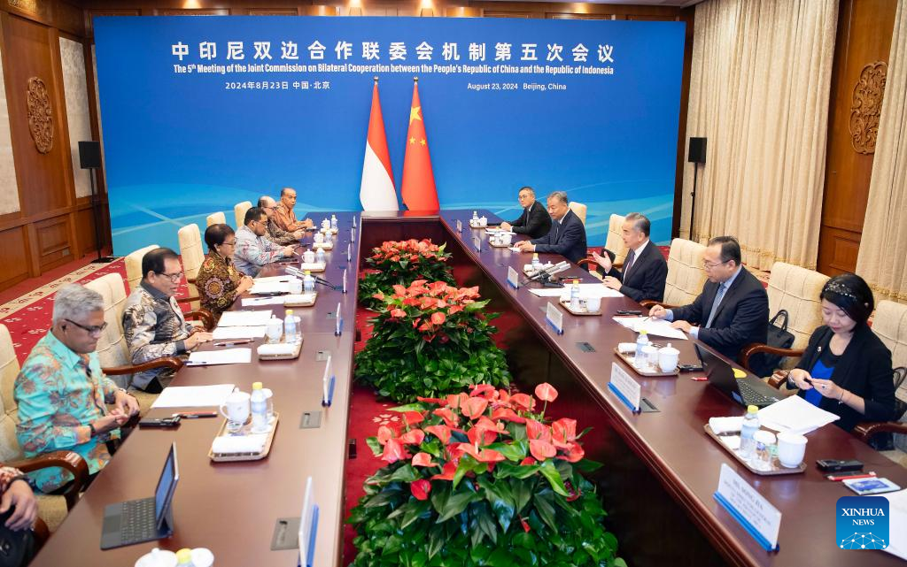 Chinese Foreign Minister Wang Yi, also a member of the Political Bureau of the Communist Party of China (CPC) Central Committee, co-chairs the fifth meeting of the China-Indonesia Governmental Joint Commission on Bilateral Cooperation with Indonesian Foreign Minister Retno Marsudi in Beijing, capital of China, Aug. 23, 2024. (Xinhua/Li Tao)