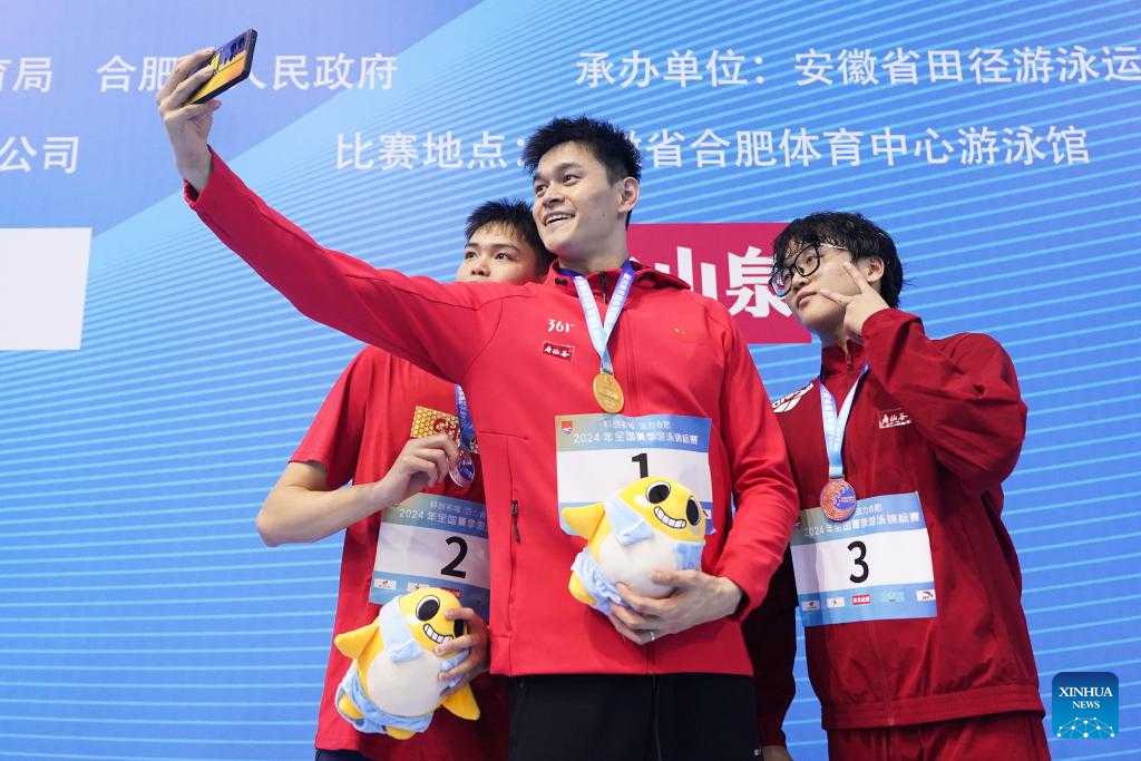Gold medalist Sun Yang(C), silver medalist Xu Haibo(L) and bronze medalist Xu Yizhou pose for group photos during the awarding ceremony after the final of men's 400m freestyle at the 2024 National Summer Swimming Championships in Hefei, east China's Anhui Province, Aug. 25, 2024. (Xinhua/Du Yu)