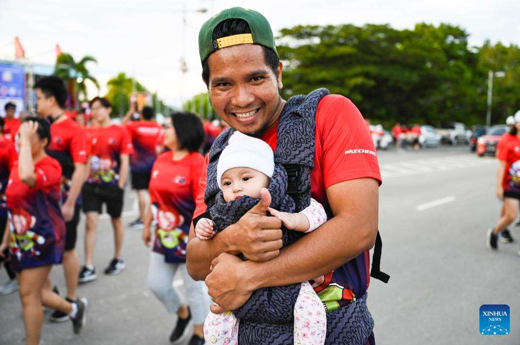 A man holding a baby participates in the Malaysia-China 2024 friendship run in Kota Kinabalu, Sabah, Malaysia, Aug. 25, 2024. Over 5,000 participants joined the Malaysia-China 2024 friendship run in Kota Kinabalu, Sabah, Malaysia on Sunday, expanding an annual event that celebrates the 50th anniversary of the establishment of bilateral ties. (Xinhua/Cheng Yiheng)