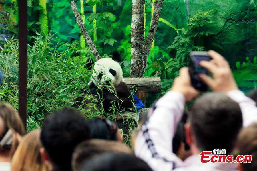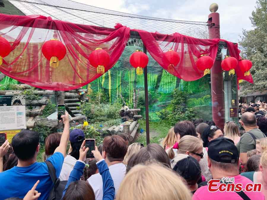 People take photos of a giant panda cub at Moscow Zoo in Russia, Aug. 24, 2024. (Photo: China News Service/Tian Bing)