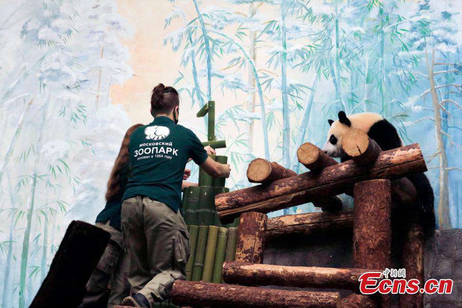 A staff member prepares a special birthday meal for Giant panda cub Katyusha at Moscow Zoo in Russia, Aug. 24, 2024. (Photo: China News Service/Tian Bing)