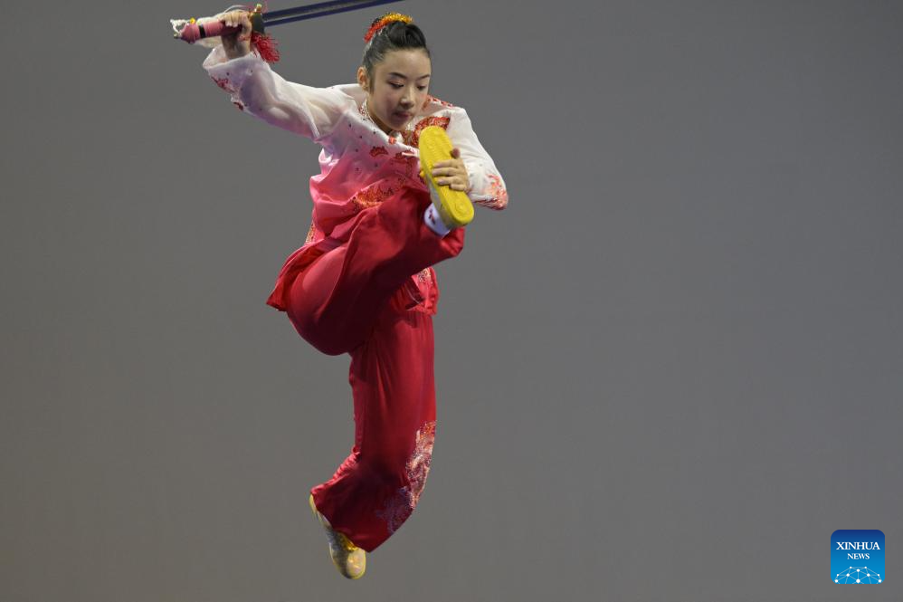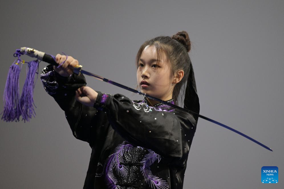 Priscilla Zou of the United States competes during the women's 3rd set IWUF Compulsory Taijijian (36 Movements) competition at the 4th World Taijiquan Championships in Singapore, Aug. 26, 2024. (Photo by Then Chih Wey/Xinhua)