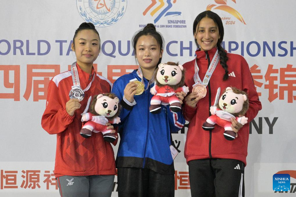 Silver medalist Cholene Aw Rui En (L) of Singapore, gold medalist Priscilla Zou (C) of the United States and bronze medalist Rojy Alaa Elsayed Ibrahim of Egypt attend the victory ceremony after the women's 3rd set IWUF Compulsory Taijijian (36 Movements) competition at the 4th World Taijiquan Championships in Singapore, Aug. 26, 2024. (Photo by Then Chih Wey/Xinhua)