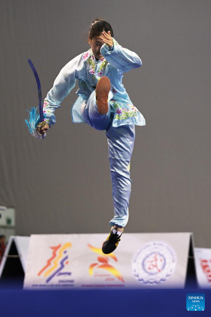 Cholene Aw Rui En of Singapore competes during the women's 3rd set IWUF Compulsory Taijijian (36 Movements) competition at the 4th World Taijiquan Championships in Singapore, Aug. 26, 2024. (Photo by Then Chih Wey/Xinhua)