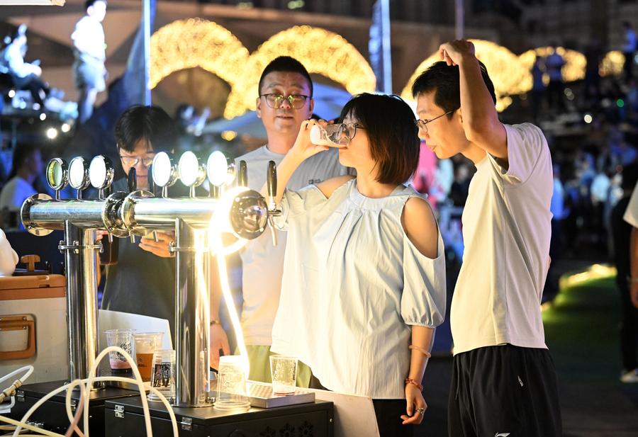Tourists taste craft beer during the 5th Tianjin Nighttime Life Festival in North China's Tianjin municipality, Aug 2, 2024. (Photo/Xinhua)