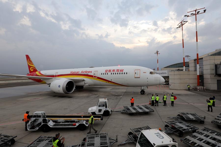 A Hainan Airlines flight taxis at the Ben Gurion Airport near Tel Aviv, Israel, Nov. 29, 2022. (Photo by Gil Cohen Magen/Xinhua)
