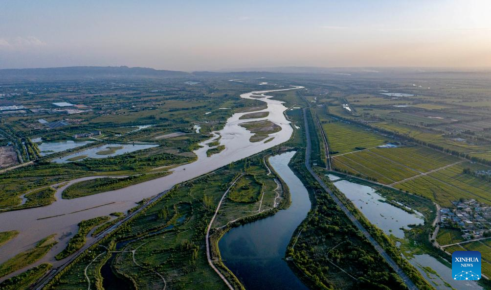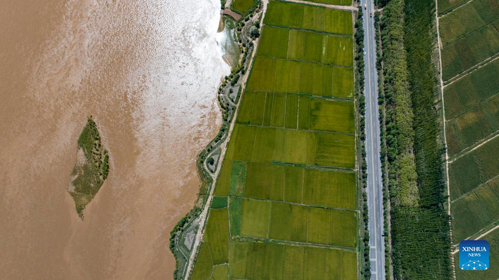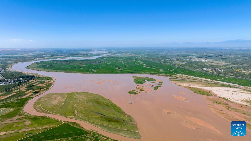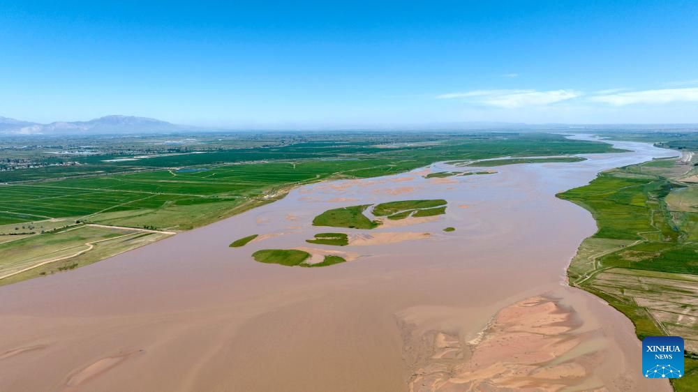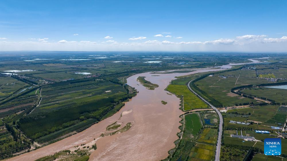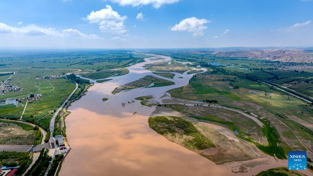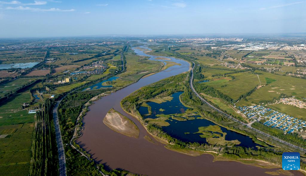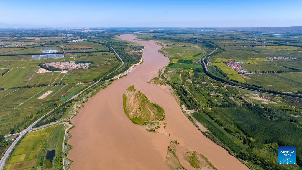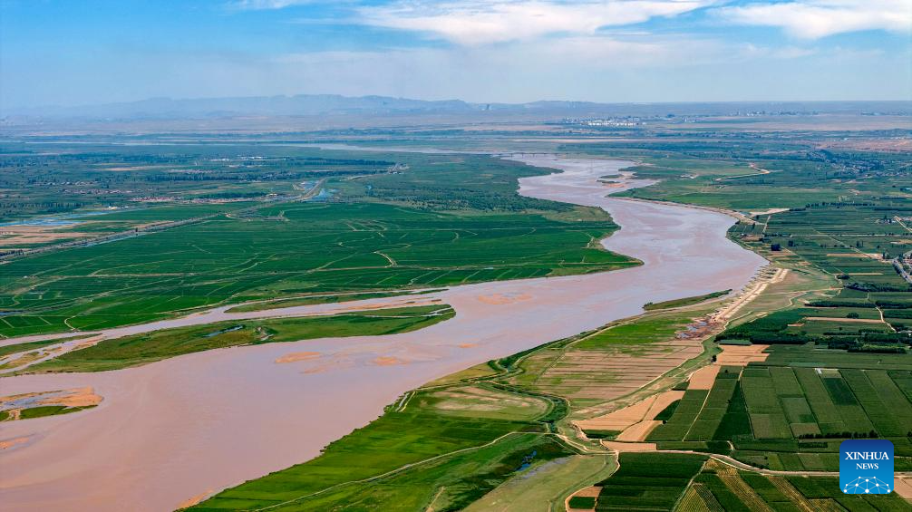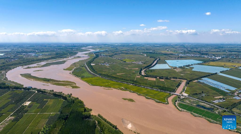 An aerial drone photo taken on July 18, 2024 shows a section of the Yellow River in Pingluo County, northwest China's Ningxia Hui Autonomous Region. In recent years, Ningxia has attached great importance to the protection and management of the Yellow River. The region has stepped up efforts to improve the ecological environment in the watershed areas of the river. (Xinhua/Yang Zhisen)