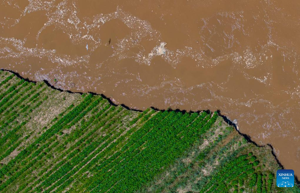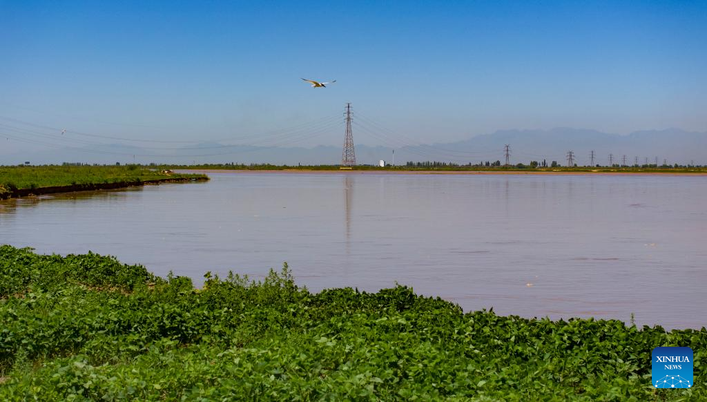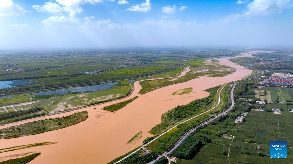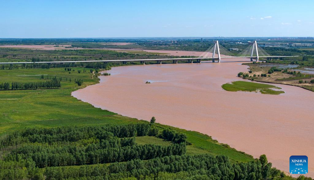A drone photo taken on July 18, 2024 shows a section of the Yellow River in Pingluo County, northwest China's Ningxia Hui Autonomous Region. In recent years, Ningxia has attached great importance to the protection and management of the Yellow River. The region has stepped up efforts to improve the ecological environment in the watershed areas of the river. (Xinhua/Yang Zhisen)