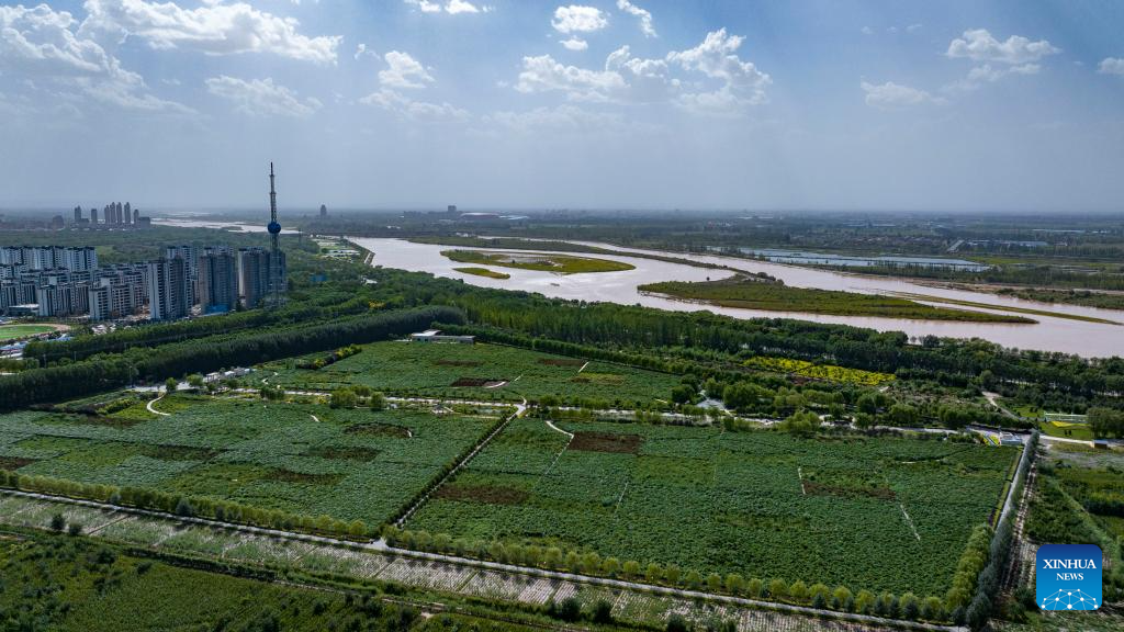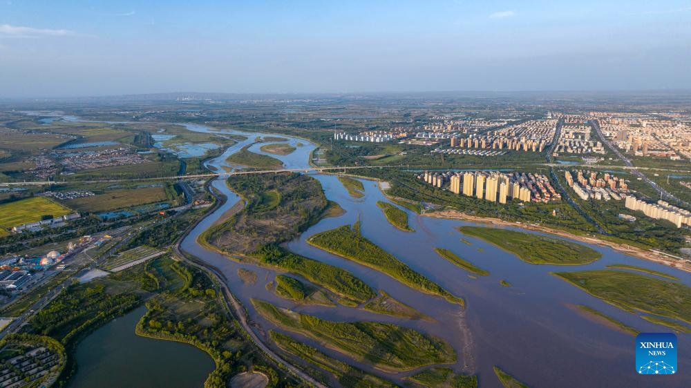 An aerial drone photo taken on Aug. 23, 2024 shows a section of the Yellow River in Litong District of Wuzhong City, northwest China's Ningxia Hui Autonomous Region. In recent years, Ningxia has attached great importance to the protection and management of the Yellow River. The region has stepped up efforts to improve the ecological environment in the watershed areas of the river. (Xinhua/Yang Zhisen)
