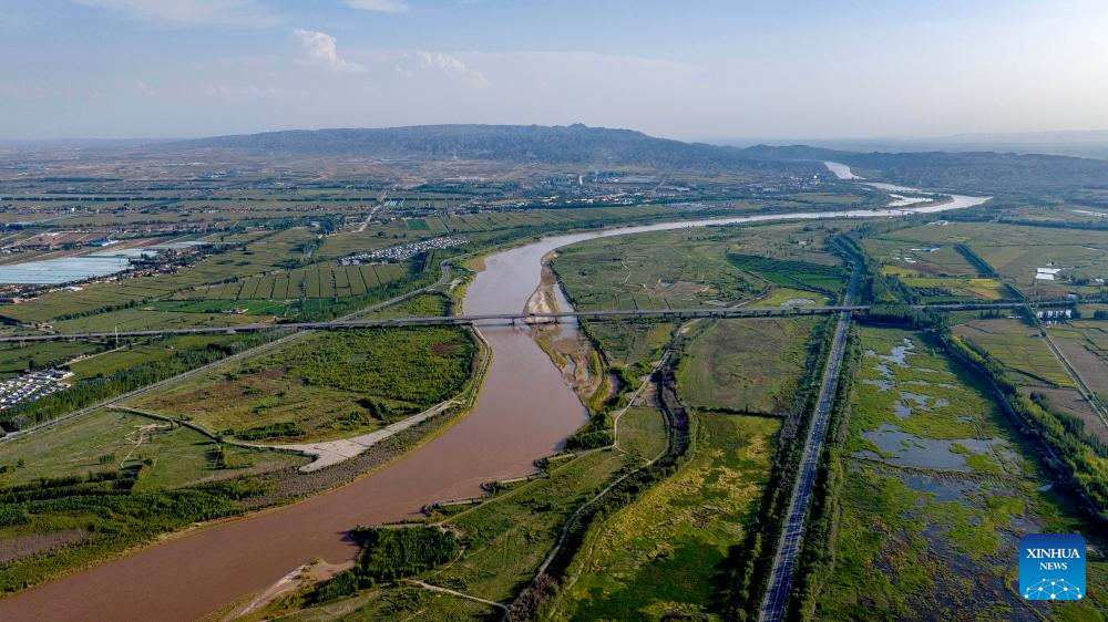 An aerial drone photo taken on Aug. 26, 2024 shows a section of the Yellow River in Yongning County, northwest China's Ningxia Hui Autonomous Region. In recent years, Ningxia has attached great importance to the protection and management of the Yellow River. The region has stepped up efforts to improve the ecological environment in the watershed areas of the river. (Xinhua/Yang Zhisen)