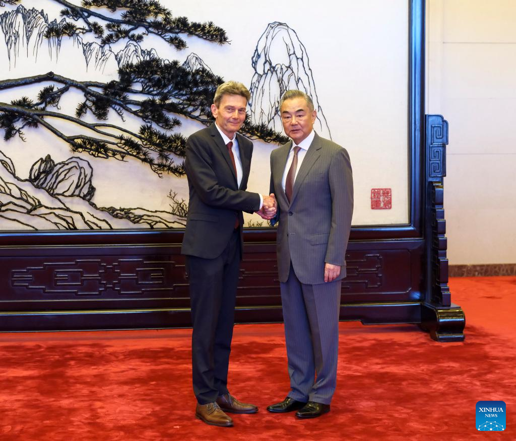 Wang Yi, a member of the Political Bureau of the Communist Party of China Central Committee and director of the Office of the Central Commission for Foreign Affairs, meets with a German Social Democratic Party (SPD) delegation led by Rolf Mutzenich, chairman of the SPD of Germany parliamentary group in the German Bundestag, in Beijing, capital of China, Aug. 27, 2024. (Xinhua/Ding Lin)