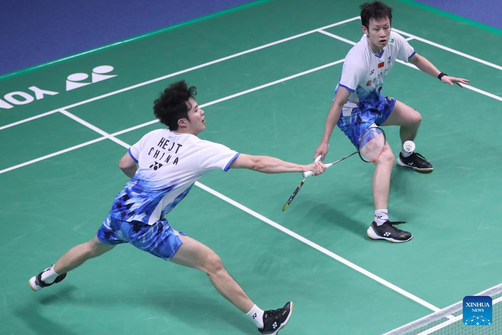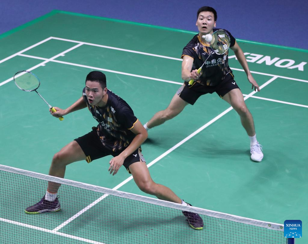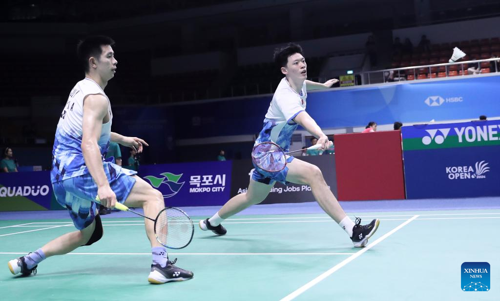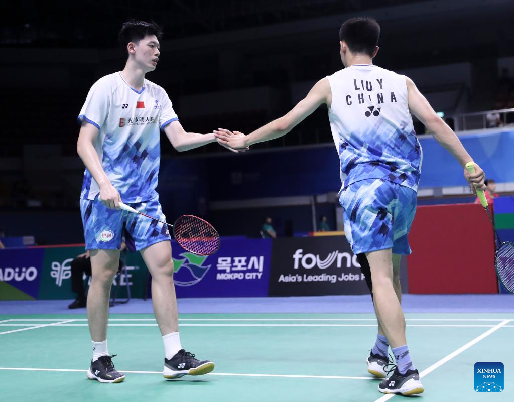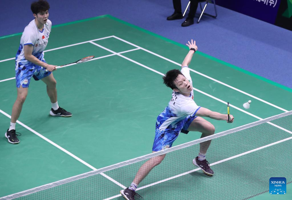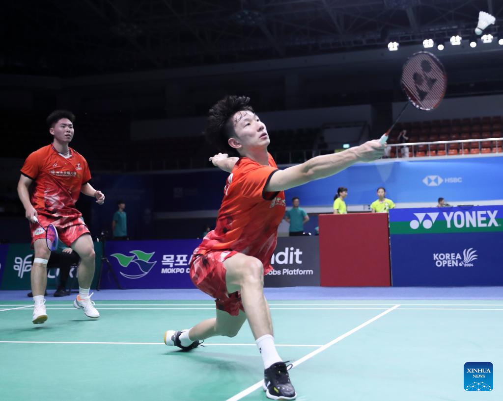 Chen Boyang (R)/Liu Yi of China compete during the men's doubles first round match against Huang Di/Zhou Haodong of China at the BWF Korea Open Badminton Championships 2024 in Mokpo, South Korea, Aug. 27, 2024. (Xinhua/Yao Qilin)