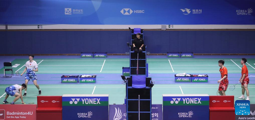 He Jiting (L)/Ren Xiangyu of China compete during the men's doubles first round match against Chiang Chien-Wei/Wu Hsuan-Yi of Chinese Taipei at the BWF Korea Open Badminton Championships 2024 in Mokpo, South Korea, Aug. 27, 2024. (Xinhua/Yao Qilin)