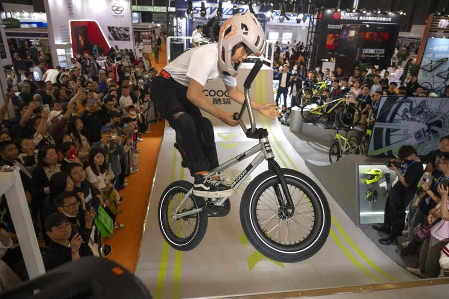A young athlete performs at the booth of COOGHI during the 32nd China International Bicycle Fair in east China's Shanghai, May 5, 2024. (Xinhua/Cai Yang)