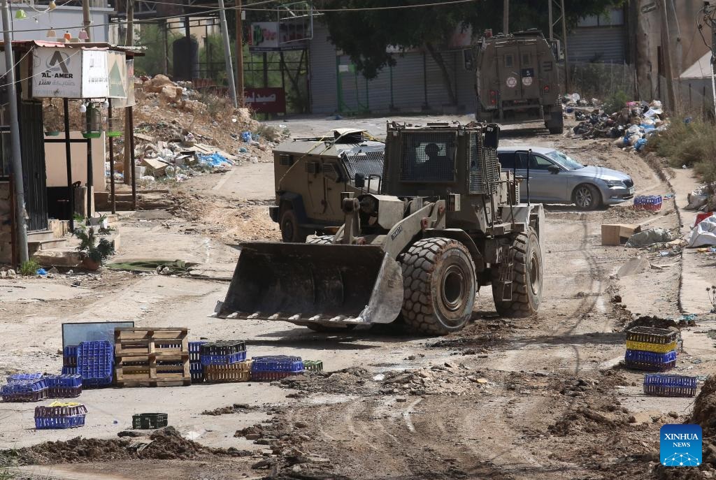 Israeli military vehicles are seen during an Israeli operation in the Far'a refugee camp, to the south of the northern West Bank city of Tubas, on Aug. 28, 2024. At least 10 Palestinians were killed on Wednesday by Israeli shelling and gunfire in the northern West Bank, according to the Ramallah-based Palestinian Health Ministry. (Photo by Nidal Eshtayeh/Xinhua)