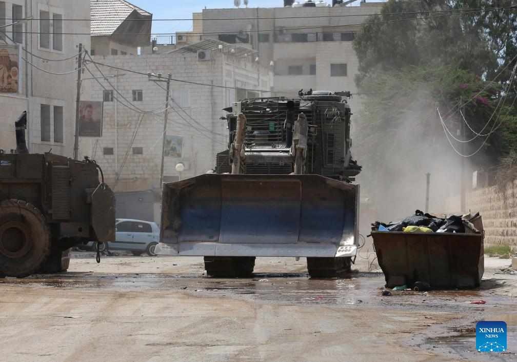 An Israeli military vehicle is seen during an Israeli operation in the northern West Bank city of Jenin, on Aug. 28, 2024. At least 10 Palestinians were killed on Wednesday by Israeli shelling and gunfire in the northern West Bank, according to the Ramallah-based Palestinian Health Ministry. (Photo by Nidal Eshtayeh/Xinhua)