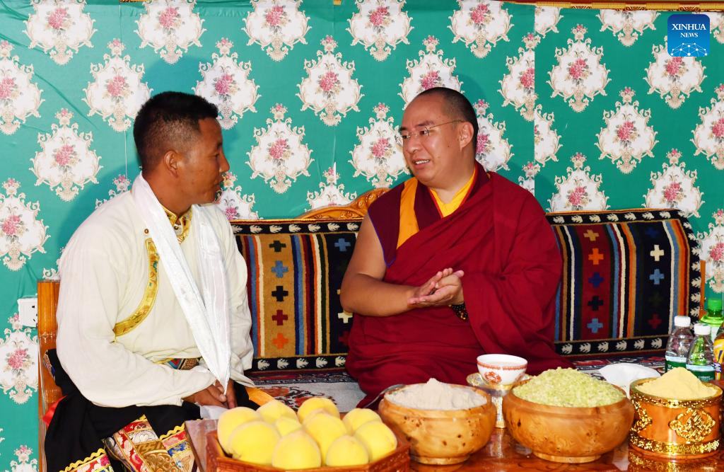 Panchen Erdeni Chos-kyi rGyal-po visits a local family in Zayu County of Nyingchi City, southwest China's Xizang Autonomous Region, Aug. 24, 2024. (Photo by Chogo/Xinhua)