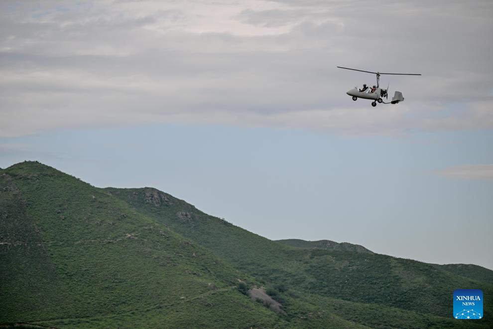Tourists have a tour on a gyrocopter at the Ulan Maodu grassland in Hinggan League, north China's Inner Mongolia Autonomous Region, Aug. 8, 2024. (Xinhua/Lian Zhen)
