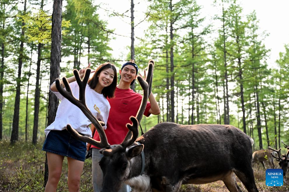 Tourists pose for photos with a reindeer at the reindeer herding site in Genhe City of Hulun Buir, north China's Inner Mongolia Autonomous Region, July 3, 2024. (Xinhua/Bei He)