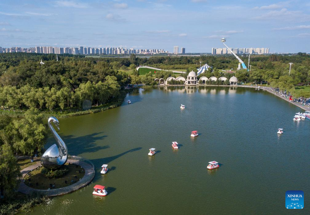 An aerial drone photo taken on Aug. 20, 2024 shows people boating at Sun Island scenic spot in Harbin, northeast China's Heilongjiang Province. (Xinhua/Wang Jianwei)