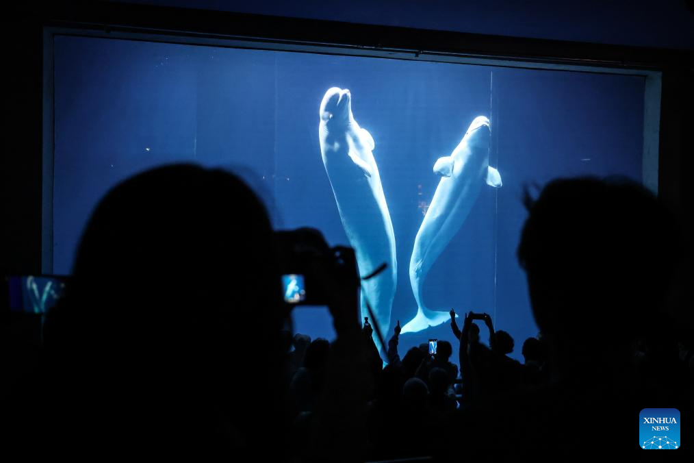 Tourists watch white whales at Sunasia Ocean World in Dalian, northeast China's Liaoning Province, May 22, 2024. (Xinhua/Pan Yulong)