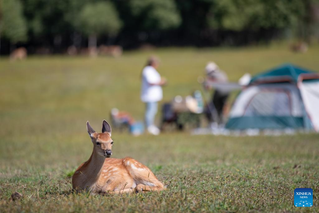 A deer rests at Shangganling stream forest park in Yichun, northeast China's Heilongjiang Province, Aug. 27, 2024. (Xinhua/Zhang Tao)