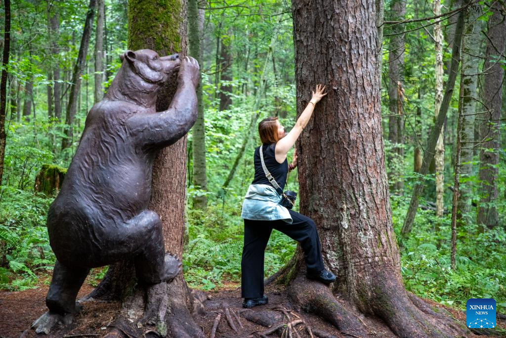 A tourist poses for a photo at Shangganling stream forest park in Yichun, northeast China's Heilongjiang Province, Aug. 27, 2024. (Xinhua/Zhang Tao)