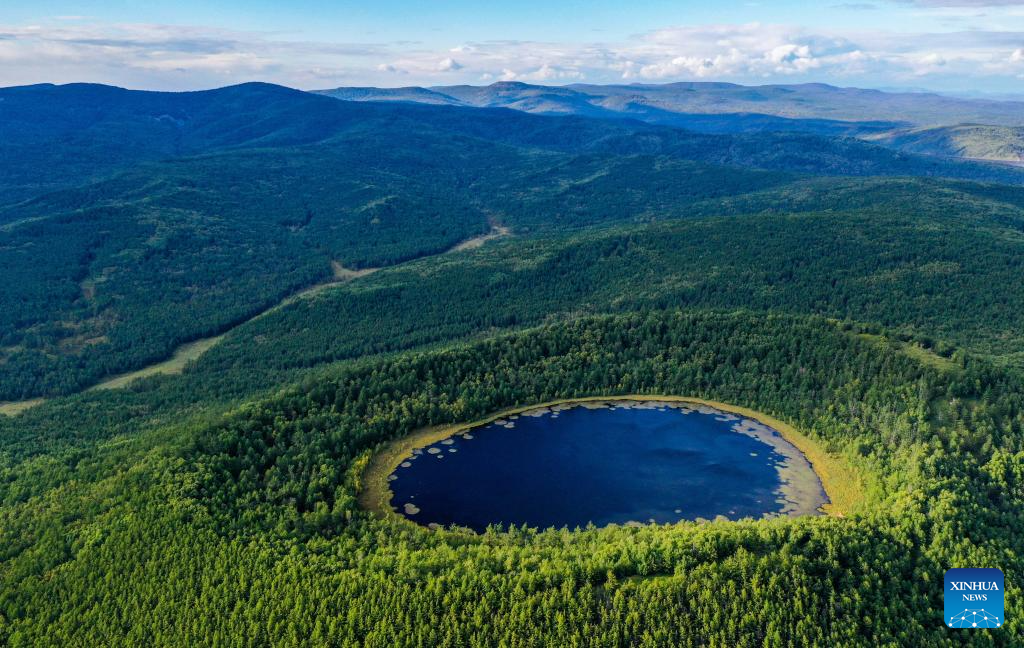 An aerial drone photo taken on Aug. 31, 2023 shows the scenery of Arxan Tianchi (Heavenly Lake) in the Arxan National Forest Park, north China's Inner Mongolia Autonomous Region. (Xinhua/Lian Zhen)