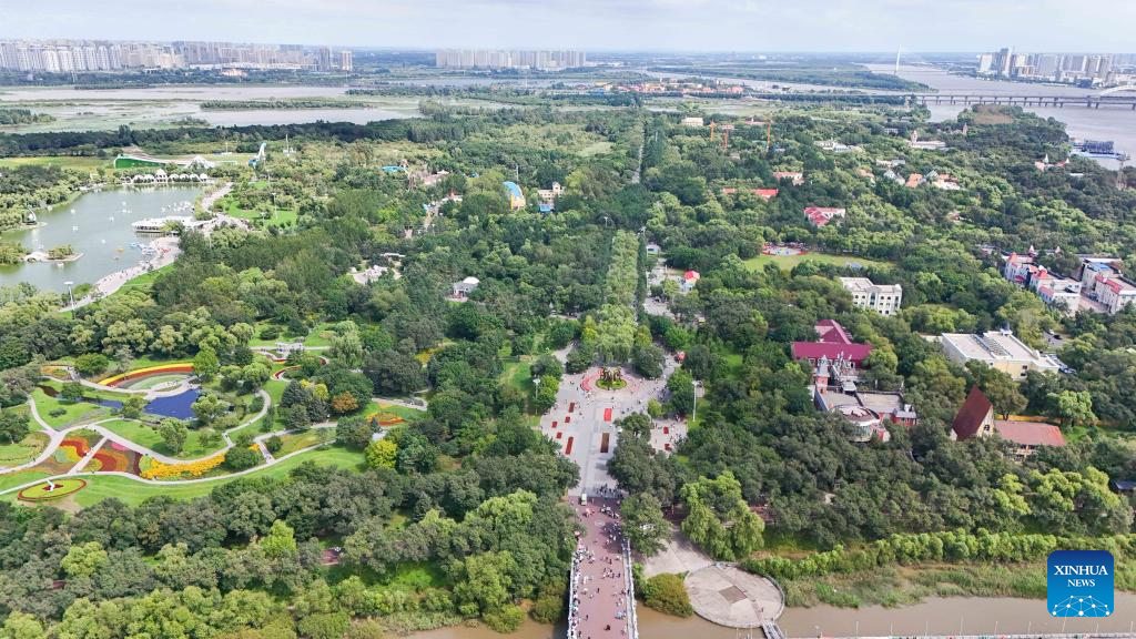 An aerial drone photo taken on Aug. 20, 2024 shows a view of the Taiyangdao (Sun Island) National Wetland Park in Harbin, northeast China's Heilongjiang Province. (Xinhua/Wang Song)