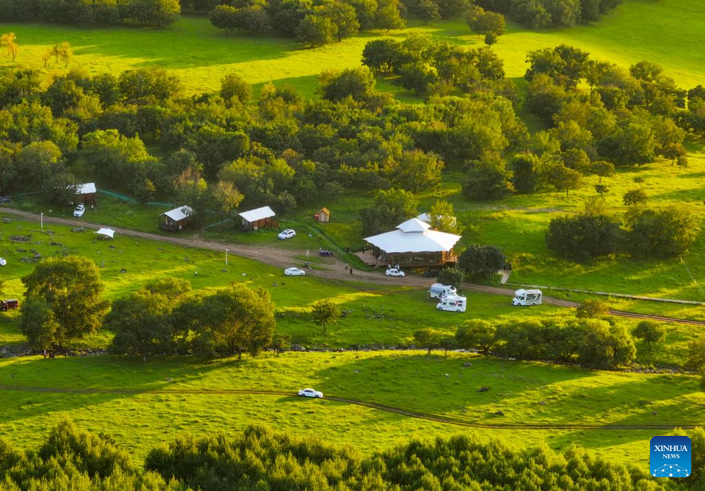 A drone photo taken on Aug. 8, 2024 shows a homestay deep in the Ulan Maodu grassland in Hinggan League, north China's Inner Mongolia Autonomous Region, Aug. 8, 2024. (Xinhua/Lian Zhen)?