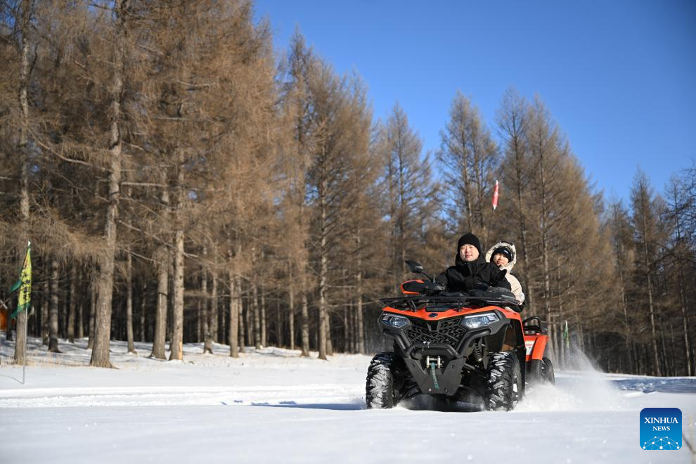 Tourists ride snowmobiles in Arxan of Hinggan League, north China's Inner Mongolia Autonomous Region, Dec. 14, 2023. (Xinhua/Bei He)