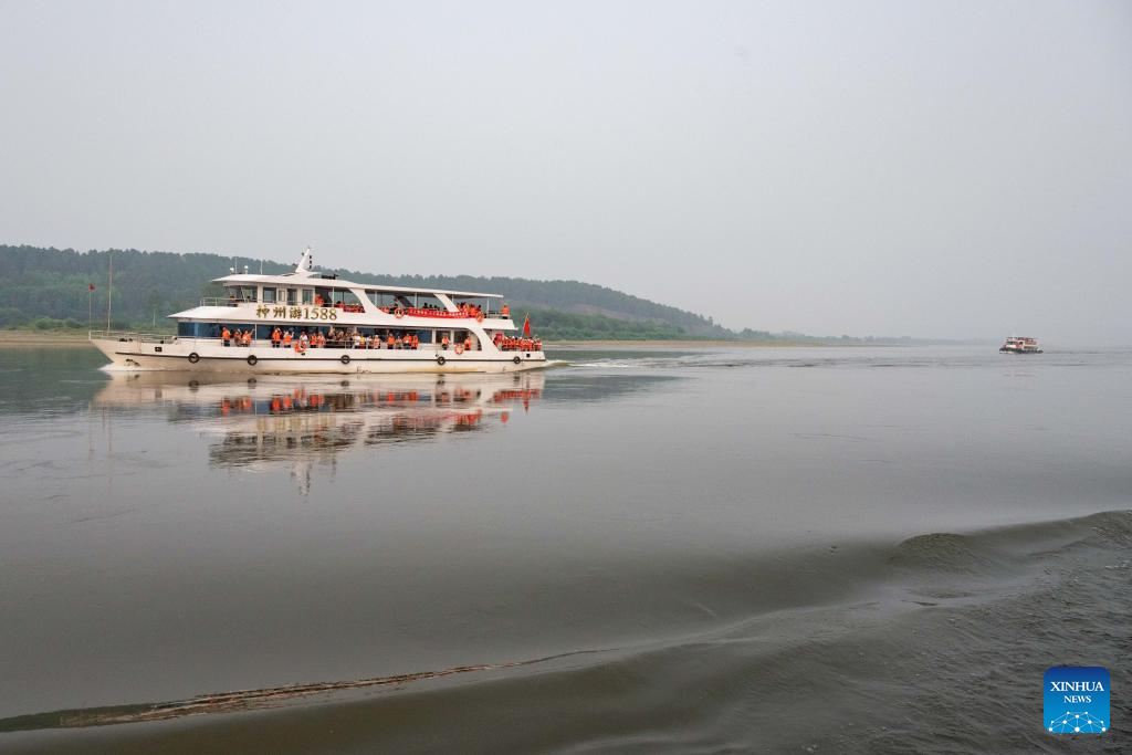 Tourists take a sightseeing boat on the Heilongjiang River in Mohe, northeast China's Heilongjiang Province, July 2, 2024. (Xinhua/Xie Jianfei)