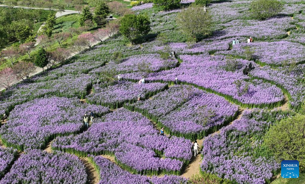 A drone photo shows tourists visiting Yinggeshi Botanical Garden in Dalian City, northeast China's Liaoning Province, May 11, 2024. (Xinhua/Long Lei)