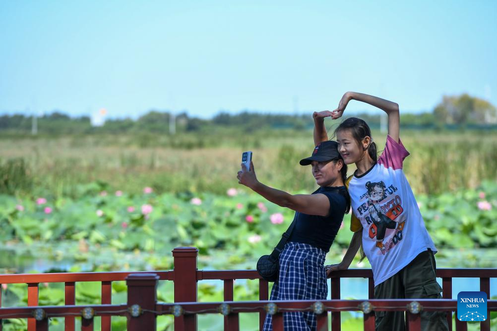 Tourists take selfies at the Chagan Lake National Nature Reserve in Songyuan City, northeast China's Jilin Province, Aug. 26, 2024. (Xinhua/Zhang Nan)